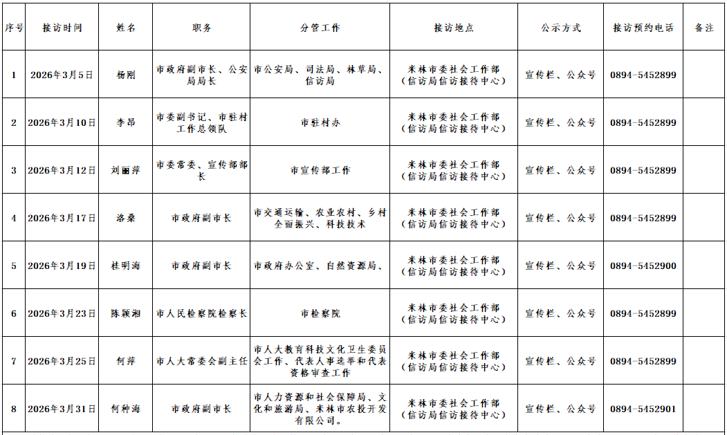 为深入学习贯彻习近平新时代中国特色社会主义思想和习近平总书记关于加强和改进人民信访工作的重要思想,进一步践行“浦江经验”,强化信访问题源头治理,依法及时解决群众合理诉求,现将2026年3月份米林市县级领导下访接访有关事项向社会公告如下: