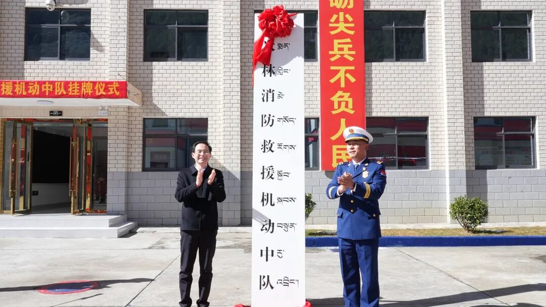 随着庄严的国歌奏响,挂牌仪式正式拉开帷幕。米林消防救援机动中队全体指战员整齐列队、士气高昂,以昂扬姿态展现出消防救援队伍的过硬作风与良好风貌。颜世辉与徐岩共同为米林消防救援机动中队揭牌。