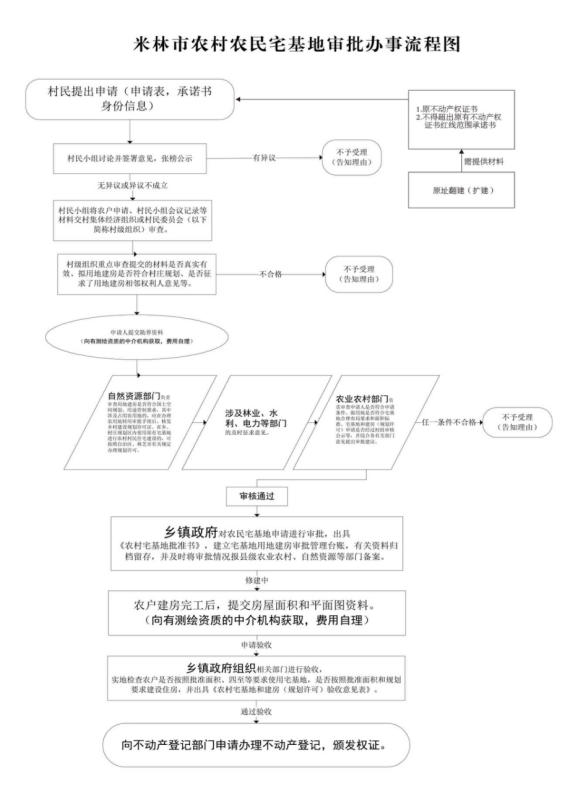 (一)依法审批原则。各乡(镇)、各行业主管部门本着对群众负责、对自己负责的态度,深入实地勘察,认真审核把关申请人是否符合申请条件,拟用地建房是否符合国土空间规划、村庄规划、用途管制要求,拟用地是否符合宅基地合理布局要求和面积标准、宅基地和建房申请是否经过村组审核公示等,严格落实“一户一宅”“建新拆旧”等政策法规,综合各相关单位意见,依法依规进行审批。宅基地用地需办理农用地转建设用地手续时,所产生的地灾报告、勘界报告、“一住两公”土壤污染调查等费用由米林市人民政府统一解决;自然资源局依照《中华人民共和国土地管理法》第四十四条的规定统一办理农用地转用相关手续。严禁农村村民未批先建或者违反规划乱占滥用土地建房。