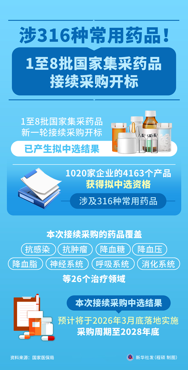 记者2月10日从国家医保局获悉,1至8批国家集采药品新一轮接续采购开标已产生拟中选结果,1020家企业的4163个产品获得拟中选资格,涉及316种常用药品。